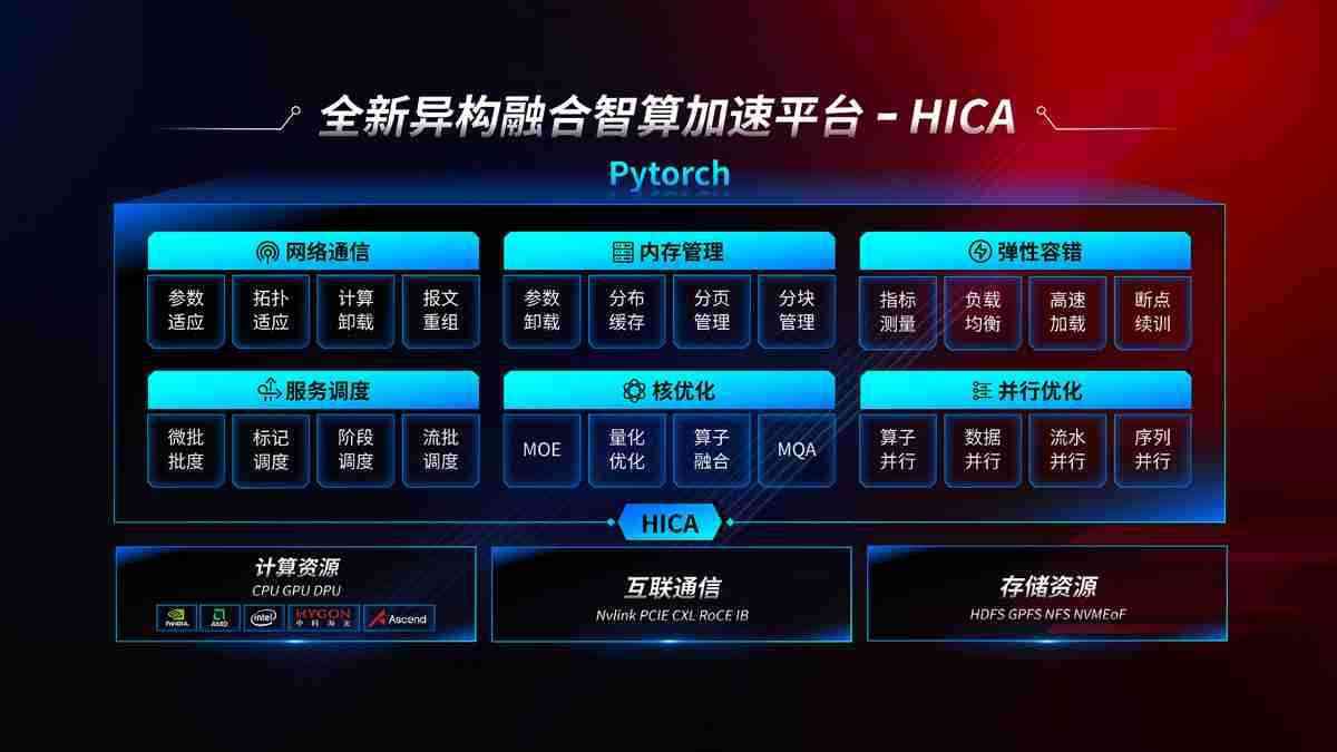 通过自研的服务层、、、中间适配层、、、以及调度编排算法,,,采用数据并行、、、模型并行等多种并行方式,,,把并行计算任务进行有效的分解,,,使其分别由相应的软件栈和算力资源来承接。。当GPU资源变化,,HICA可以实时动态调度计算子任务并调整模型拓扑和架构,,以充分聚合各种算力资源。。。